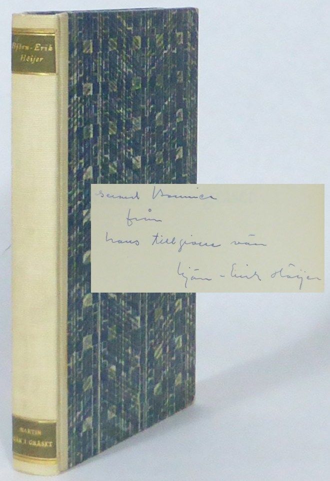 Stockholm; Tidens förlag, 1950. Originalupplaga. 21,5x14,5 cm. 278, (1, 1 blank) s. Ljusbrunt halvklotband (Bonniers bokbinderi) med ryggetiketter i grönt skinn, mönstrade pärmpapper. Omslaget medbundet. Fint ex. Första delen i Höijers självbiografiska romankvartett om Martin Skoog, det verk som han främst blivit ihågkommen för. Med dedikation till förläggaren Gerard Bonnier: ""Gerard Bonnier från hans tillgivne vän Björn-Erik Höijer"".