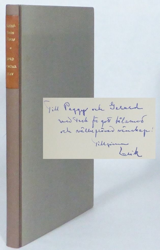 Stockholm; Bonniers, 1956. 26,5x17,5 cm. 136, (2, 2 blanka) s. Osignerat klotband i brunt och grått med ryggetikett i rött skinn. Omslaget medbundet. Översta delen av främre pärmen obetydligt blekt. Främre omslaget med några små fläckar. Fint ex. Dikterna är hämtade ur samlingarna Èloges, Anabase, Vents, och Amers. Med förord av Lindegren. Dedikation från Lindegren till bokens förläggare Gerard och Peggy Bonnier: ""Till Peggy och Gerard med tack för gott tålamod och välbeprövad vänskap! / tillgivne Erik"".
