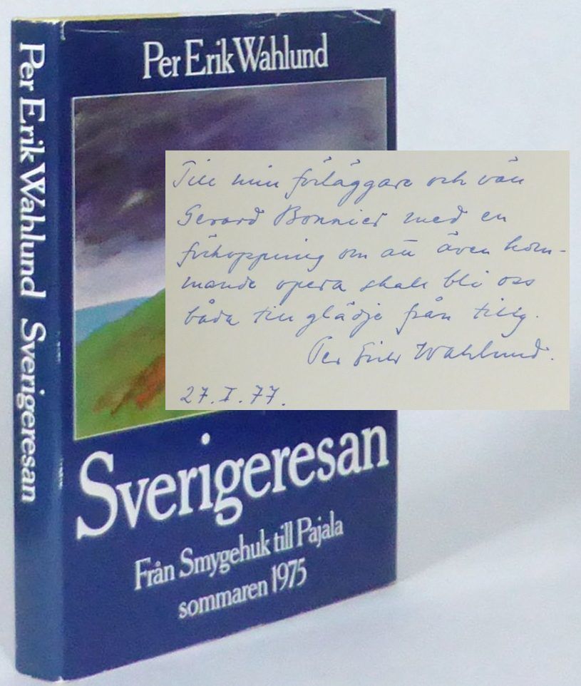 Stockholm; Bonniers, 1976. Originalupplaga. 20,5x16 cm. 187, (2, 1 blank) s. Förlagets pappband med tryckt skyddsomslag. Några riss I skyddsomslaget. Bra ex. Dedikation: ""Till min förläggare och vän Gerard Bonnier med en förhoppning om att även kommande opera skall bli oss båda till glädje från tillg. Per Erik Wahlund / 27.I.77.""