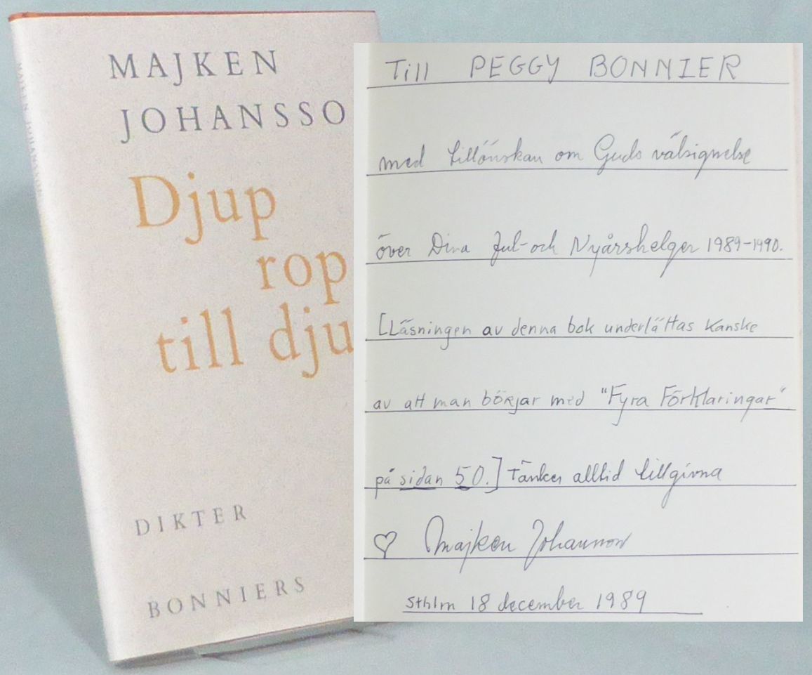 Stockholm; Bonniers, 1989. Originalupplaga. 23,5x16 cm. 50, (1, 1 blank) s. Förlagets pappband med tryckt skyddsomslag. Ett litet riss överst på omslagets främre panel. Fint ex. Efter 20 års tystnad återkom Johansson med sin sista diktsamling, för vilken hon bl. a. erhöll Samfundet De Nios stora pris. Dedikation: ""Till PEGGY BONNIER / med tillönskan om Guds välsignelse över Dina Jul- och Nyårshelger 1989-1990. [Läsningen av denna bok underlättas kanske av att man börjar med 'Fyra Förklaringar' på sidan 50.] Tänker alltid tillgivna [tecknat hjärta] Majken Johansson / Sthlm 18 december 1989"". Med ett bilagt julkort signerat av författaren.