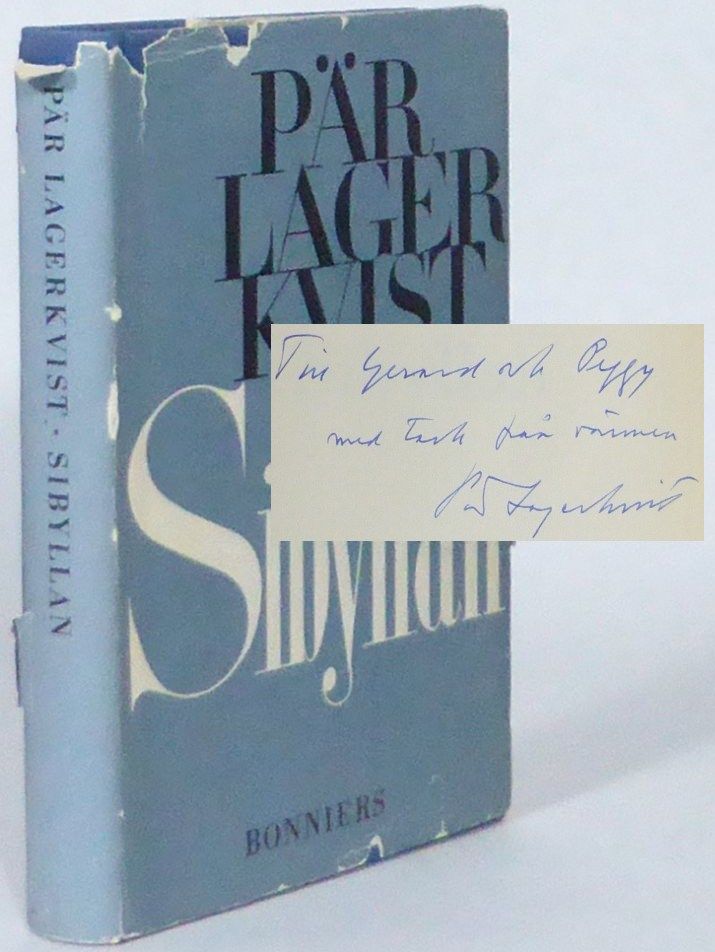 Stockholm; Bonniers, 1956. Originalupplaga. 19x13 cm. 221, (1) s. Förlagets klotband med tryckt skyddsomslag. Främre omslag medbundet. Omslaget revigt, i övrigt ett fint ex. Romanen är en sorts återblick där författaren uppträder i rollen som oraklet i Delfi. Han tar också upp metafysiska frågeställningar från diktsamlingen Aftonland, vilka fortsätts i den kommande trilogin Pilgrimen. Dedikation till förläggarna Gerard och Peggy Bonnier: ""Till Gerard och Peggy med tack från vännen Pär Lagerkvist"".