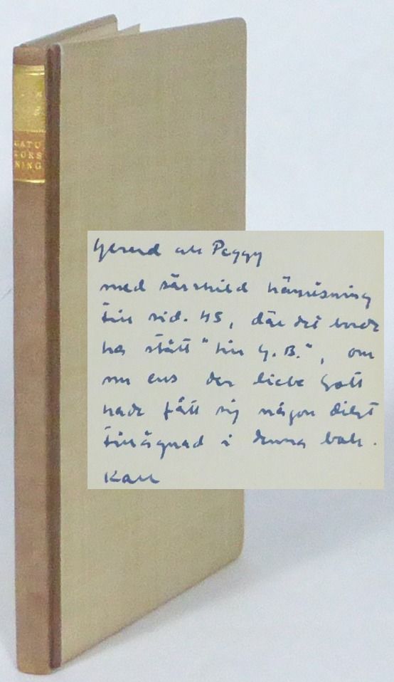 Stockholm; Bonniers, 1952. Originalupplaga. 20,5x14,5 cm. 74, (3, 1 blank) s. Klotband i mörkare och ljusare brun nyans (Bonniers bokbinderi) med författar- och titeletikett i grönt resp. rött skinn. Omslaget medbundet. Några små mörka prickar på pärmarna. Fint ex. Dedikation till förläggarna Gerard och Peggy Bonnier: ""Gerard och Peggy / med särskild hänvisning till sid. 45, där det borde ha stått ""till G. B."", om nu ens den liebe Gott hade fått sig någon dikt tillägnad i denna bok. / Karl"". Några svaga bläckstreck på denna sida, som innehåller dikten ""Torgen huttrar"". I slutet av boken finns ett infäst brev från Vennberg, maskinskrivet och signerat, där han tillönskar Gerard och Peggy en god julhelg samt skriver: ""... eftersom julen på Lilla Essingen skiljer sig avsevärt från julen i storstaden, ville jag som en extra julhälsning gärna skicka med några versrader om stämningarna i denna del av världen."" Därefter följer en tidigare version av dikten ""Torgen huttrar"". Brevet är odaterat men troligen avsänt i mellandagarna 1951.
