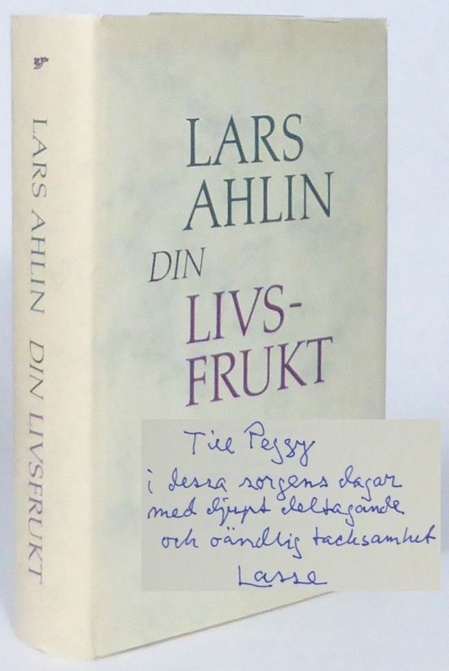 Stockholm; Bonniers, 1987. Originalupplaga. 23,5x16,5 cm. 613, (1) s. Förlagets pappband med tryckt skyddsomslag. Omslag av Marie Sterte. Sista sidan med etiketten ""Läsexemplar för bokhandeln"". Ett par riss överst på skyddsomslagets främre panel. Fint ex. Dedikation till förläggaren Peggy Bonnier, med hänvisning till maken Gerards bortgång samma år: ""Till Peggy i dessa sorgens dagar / med djupt deltagande och oändlig tacksamhet / Lasse"".