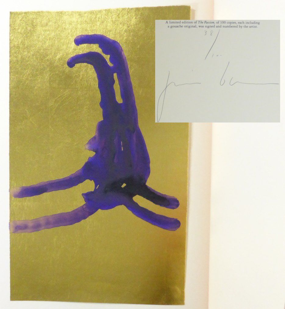 Lund; Propexus, 1991. First edition. 50,5x32,5 cm. (43, 43 blanks) pp. + gouache. Original printed lilac cloth (Knut Hässlers Bokbinderi, Stockholm). Designed by Gert Fors, John Melin, and Anders Tornberg. There are a few small specks on the front board. A very fine copy. ""These forty drawings, now shown for the first time, were made with coffee by James Brown during Easter of 1988 when he took part in an annual religious event: a procession which chronicles the last hours of Christ, realized by prisoners on the island of Procida near Naples."" (from the gallery leaflet, not present here). The book was published on the occasion of Brown's exhibition at Anders Tornberg Gallery in Lund, Sweden, November-December, 1991, and was issued in 1400 copies, and 100 copies numbered and signed by the artist, including an original gouache. This is the signed no. 38 of 100, with an original gouache.