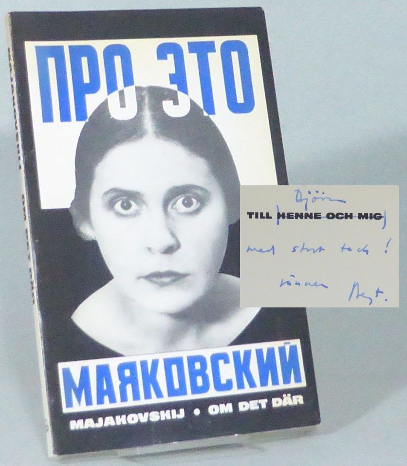 Stockholm; Bokomotiv, 1980. Originalets titel: Pro eto (1923). 23x14 cm. 83, (1 blank) s. Häftad med tryckt omslag. Bakre omslaget lätt solkat. Fint ex. Med en dedikation från Jangfeldt till Björn Julén: ""Till Björn med stort tack! / vännen Bengt"". Åkerström, Bibliografi över rysk skönlitteratur översatt till svenska (2011) s. 358.