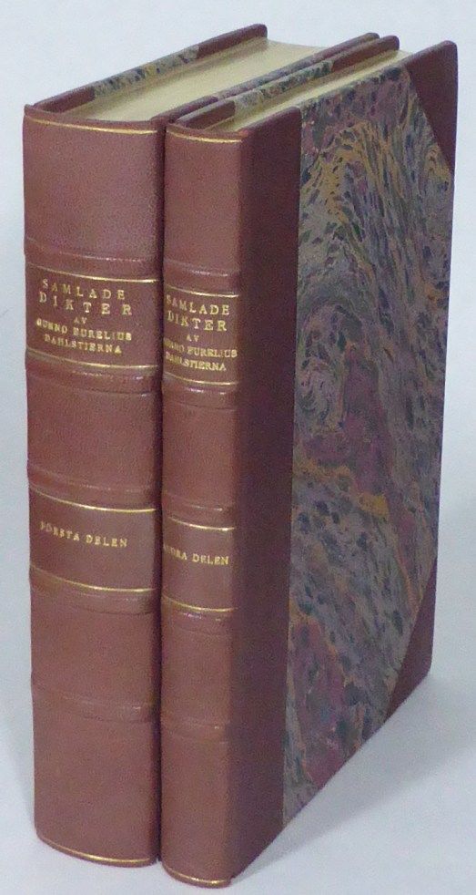 Stockholm; Bonniers, 1920-1928. (Svenska författare utgivna av Svenska Vitterhetssamfundet VII). 24x17,5 cm. vi, 421, (1 blank) & xvi, 169, (3, 4 blanka) s. Två samtida rödbruna, osignerade halvfranska band med förgyllda ryggtitlar, upphöjda bind, marmorerade pärmpapper och övre guldsnitt. Omslag ej medbundna. Ryggarna aningen blekta och obetydligt nötta. Fint ex. Med en introduktion av Noreen i andra volymen, där han bl. a. kommenterar Hansellis utgåva av Dahlstiernas dikter från 1863: ""... ej fullständig och i likhet med Hansellis alla textupplagor föga tillförlitlig."" Noreen publicerade även ett fåtal nyfunna dikter av Dahlstierna i Samlaren 1940.
