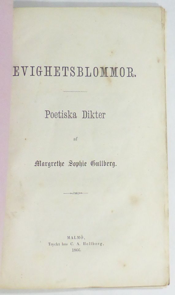 Malmö; tryckt hos C. A. Hellborg, 1866. Originalupplaga. 20x13 cm. 62 s. Häftad med samtida blankt omslag. Omslaget lätt solkat och med mindre ryggförluster. Inlagan ställvis lätt fläckad. Två ark har lossnat från ryggen. Fint ex. Gullberg (1821-1881), född Piculell i Fjelie socken och inflyttad till Malmö 1850 med sin andre man, guldsmedsgesällen Bengt Gustaf Gullberg. ""Malmös första kända författarinna"" enligt Malmö Stadsarkiv. Hon försörjer sig genom att undervisa kvinnor i skrivande och genom att själv skriva brev, verser och gratulationer på beställning, samt säljer ""Lagad middagsmat för 12 skilling portionen"" (tidningsannons via Malmö Stadsarkiv). Både hon och hennes man försörjer sig sedermera som stadsvaccinatörer. Hon debuterar 1850 med ""Ny kastbok"". Ett oskyldigt tidsfördrif i ungdomliga sällskaper"", följd av novellen ""Landsflyktingen"" (1851) samt fem diktsamlingar varav detta är den tredje. Bland dikterna finns ""Jätten Finn och Sanct Laurentius (Traditionen om Lunds tempelbyggnad)"", ""De äkta perlorna. Till min Dotter"", ""Den hopplösa kärlekens junimorgon"", ""Några dagar vid Ringsjön. Reseminne"" och ""Afsked till min kaffekittel"". Boken avslutas med novellen ""Dottersonen. En tafla ur lifvet"". Leijonhufvud & Brithelli, Kvinnan inom svenska litteraturen intill år 1893 s. 83-84.