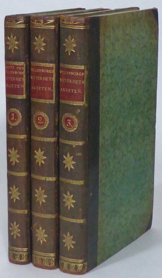 Stockholm; tryckt hos Johan A. Carlbohm, 1795-1798. 8:o. 20,5x13 cm. (7, 1 blank), 252 & porträttplansch, (7, 1 blank), 232 & (3, (1 blank), 103, (1) & (5, 1 blank), 333, (1) s. Tre samtida mörkbruna halvfranska band med förgylld ryggdekor, ryggetiketter och nummerskyltar i rött skinn, marmorerade pärmpapper. Ryggar och pärmhörn lätt nötta. Liten förlust vid nedre hörnet på s. 161/162 i första volymen. Två mindre förluster i övre marginalen på sista bladet i Försök om skaldekonsten. En liten nagg i nedre marginalen på sista bladet i Theater-stycken. Fina inlagor med endast ett fåtal spridda småfläckar. Komplett uppsättning av den av Gyllenborg själv redigerade samlingsutgåvan som han försett med flera förord och kommentarer om verken. Försök om skaldekonsten publicerades här för första gången. Gardar Sahlberg skriver i Svensk biografiskt lexikon: ""Hur starkt förbunden Gyllenborg var med ungdomsvännen Creutz framgår av att han sammanförde dennes dikter med sina egna i utgåvan Vitterhetsarbeten af Creutz och Gyllenborg (1795).""