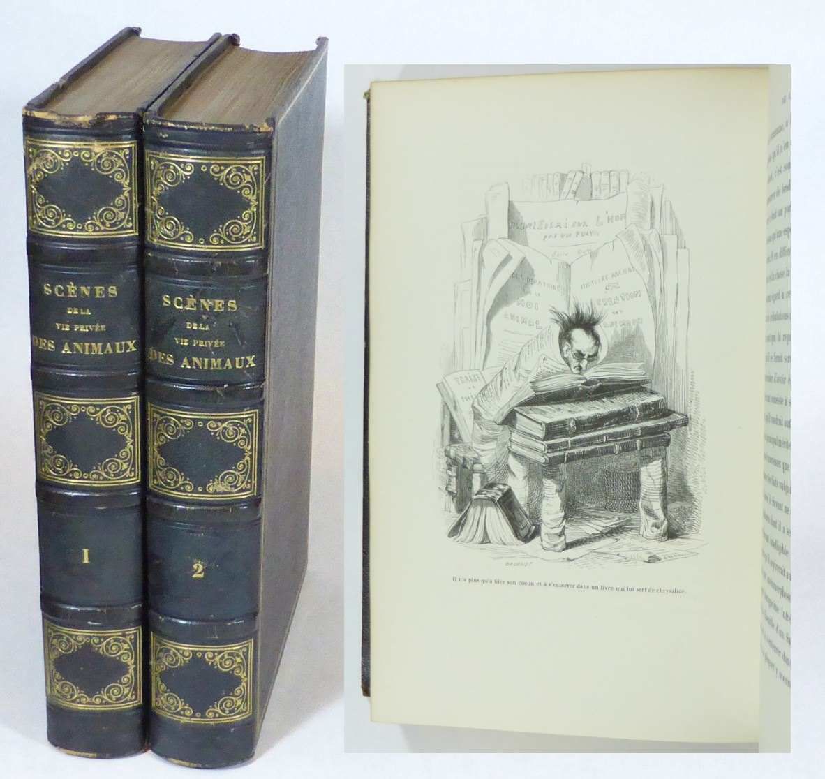 Paris; J. Hetzel, 1842. First edition. 8:o. 26,5x19 cm. (7, 1 blank), 386, (6) pp. + 96 wood-engraved plates & (3, 1 blank), 390, (6) pp. + 105 wood-engraved plates. With numerous head- and tailpieces, initials and vignettes, engraved by Brévière, Godard, and others after drawings by Grandville. Two volumes in contemporary black full leather, raised band son spine, gilt in compartments, gilt edges and marbled endpapers. The bindings are slightly worn at extremities and have small losses at head of spine. The frontispiece in Vol. I has a vertical folding mark in the inner margin, close to the gutter, and the last two leaves in the register have a small rift in outer margin. Contents are clean and bright, with occasional light foxing. A well-preserved set. The publisher Hetzel, who also contributed with texts to this publication under the pen name P.-L. Stahl, states in the preface that the primary objective with this work was ""to give words to Grandville's marvellous animals, and to join our pen with his pencil, thereby coming to his assistance in criticizing the abberrations of our epoch, and by preference among these abberrations, those which are of every period and every country."" (Ray, The Art of the Illustrated French Book 1700 to 1914, 194). Vicaire VII:405-406.