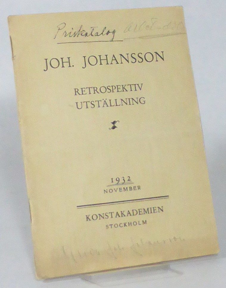 Stockholm; Konstakademien, 1932. 19,5x14,5 cm. 22 s. Illustrerad. Klammerhäftad med tryckt omslag. Vikt en gång. Omslaget något nött, med fuktfläckar och reva vid båda ryggändar. Inlagan med några svaga fläckar. Med Johanssons hustru Gerdas namnteckning samt tillägget ""Priskatalog"" på främre omslag. Med prisnoteringar i blyerts vid de flesta av de 151 utställda objekten, ibland med tillägg av köpare, t. ex. ""Nationalmuseum Oslo"".