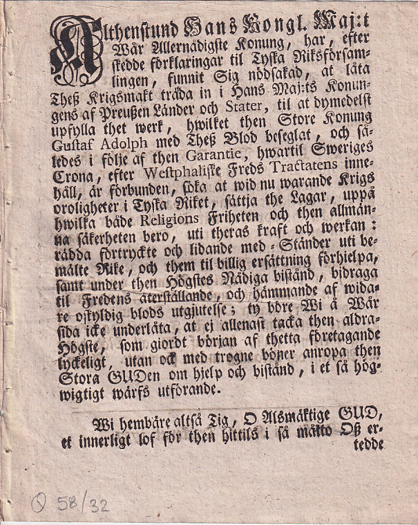 Quiding ‘Svenskt allmänt författningsregister ...’ s. 140:24. Komplett med det blanka avslutande bladet. Bön i anledning av krigsoroligheterna i Tyska riket (Pommerska kriget).