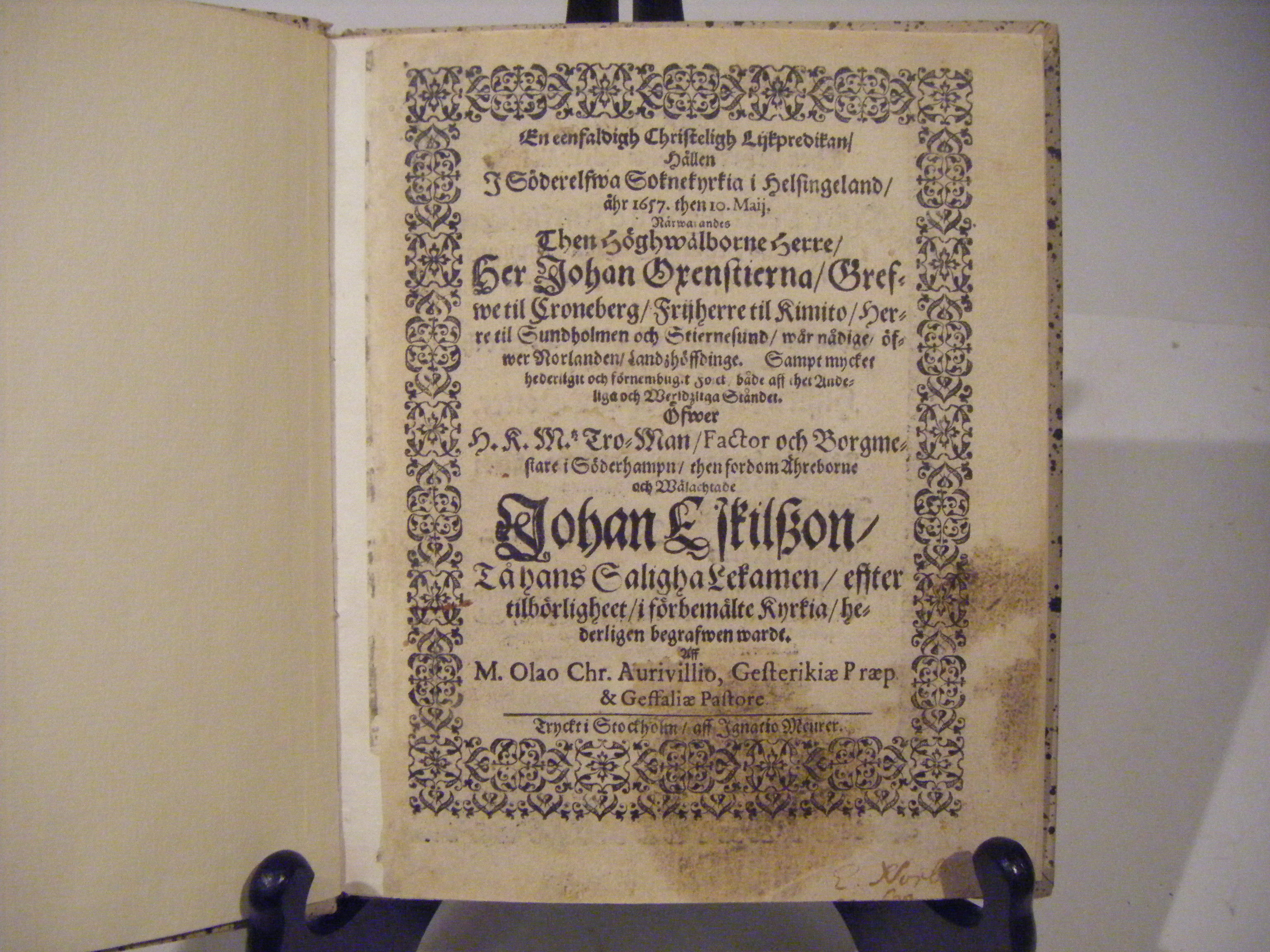 Stockholm, Meurer otan år (1657), (62) sidor. Liten 4:o. Inbunden i ett nyare stänkmarmorerat pappband. Fläck på första bladet. Vackert ramtryck.