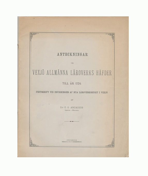 Med uppsatserna: ”Domkyrkoskolan före reformationen”, ”Domkyrkoskolan från refomationen till gymnasiets inrättande 1643” och ”Gymnasiet och trivialskolan 1643-1724”. Carl Olof Arcadius (1849-1921) var lektor i historia vid gymnasiet och även medförfattare till ”Växjö stifts herdaminne”.
