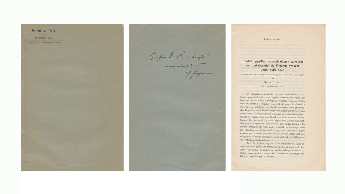 Spridda uppgifter om navigationen samt lots- och båkväsendet vid Finlands sydkust under äldre tider. (Föredrag hållet vid Sällskapets för Finlands geografi årsmöte den 10 april 1897.). (Med 3 planscher och 1 karta). [Särtryck ur] Fennia, 14, 6.