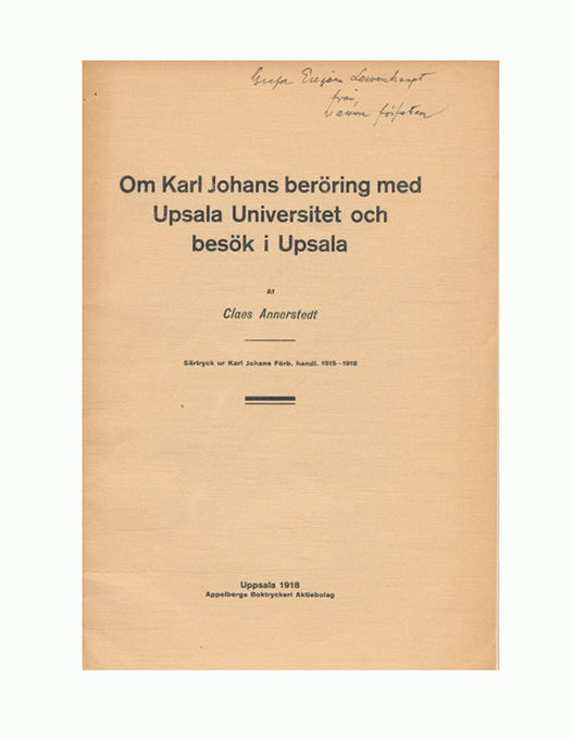 Om Karl Johans beröring med Uppsala universitet och besök i Uppsala. Särtryck ur Karl Johans förb. handl. 1915–1918.