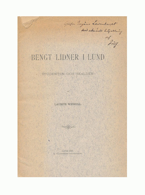 Lund, 1895. (2),31 s. Häftad, i delvis blekt tryckt omslag med ett par kantrevor. Dedikation till Eugène Lewenhaupt. Från Säbylunds bibliotek.
