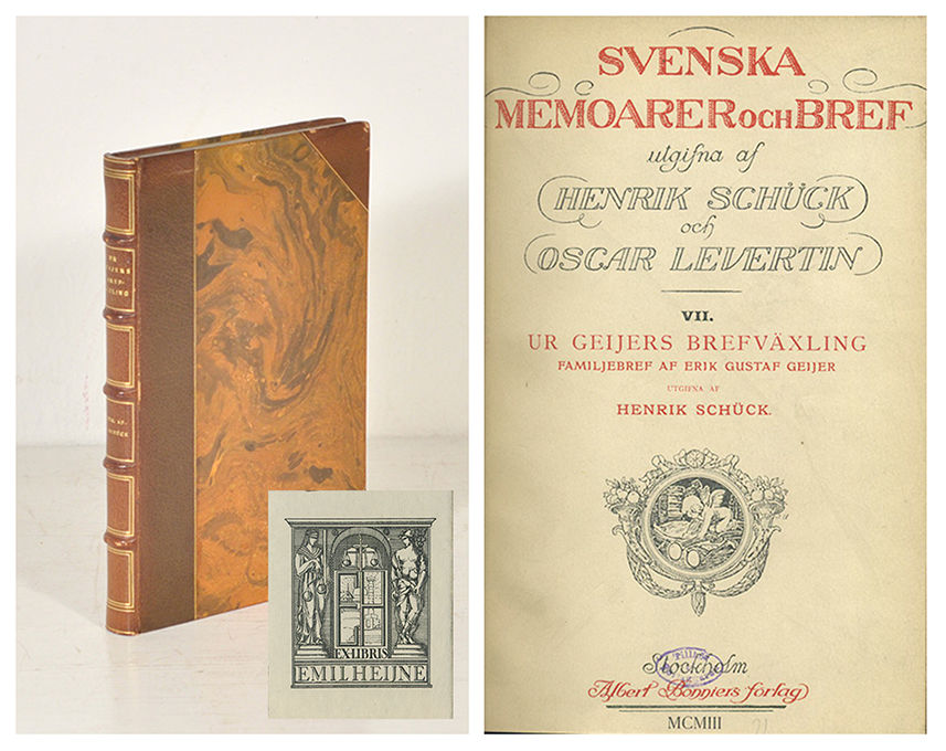 Sthlm, 1903. XX,226 s. Elegant brunt halvmarokängbd med upphöjda bind, guldornerad rygg, marmorerade pärmpapper, marmorerade snitt och medbundet främre omslag (Nordiska bokhandeln). Ett par av de upphöjda binden lite lätt nötta och pärmhörnen lite stötta. Främre omslaget med förlagsstpl. Med Emil Heijnes exlibris.