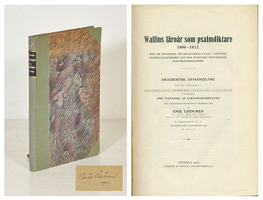 Uppsala, 1916. XVI,246,(1) s. Grönt hklbd med titeletikett av svart skinn, klistermarmorerade pärmpapper och stänkta snitt. Pärmarna blekta i övre kant, liten vit fläck överst på ryggen. Bertil Åstrands namnteckning, daterad 1923, på försättsbladet.