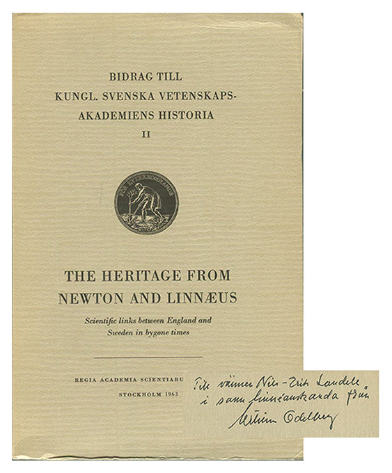 Bidrag till kungl. svenska Vetenskapsakademiens historia II. Med engelsk titel på omslaget: ”The heritage from Newton and Linnæus. Scientific links between England and Sweden in bygone times”. Utställningskatalog från Historiska museet sammanställd av W. Odelberg, C.-O. von Sydow och A. Andersson. Intressant vetenskapshistorisk utställning med omfattande kommentarer. De avslutande planscherna i första delen utgörs av annonser.