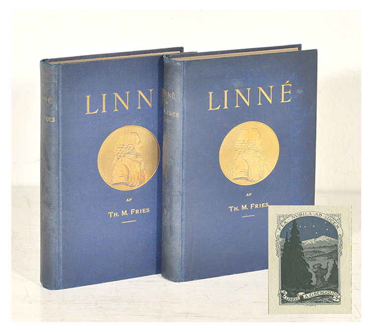 Sthlm, 1903. (4),364,1-48 + IV,444,1-46,(1) s. Två något nötta mörkblå oklbd med guldtryckta titlar både på ryggarna och främre pärmarna samt förgyllda medaljongporträtt av Linné på frampärmarna (Lorentz G. Forsbergs bokbinderi, Norrköping). Ryggarna fuktfläckiga och pärmarna med en del ojämna nötningar, troligen orsakade av silverfisk. En liten fläck på övre snittet på första volymen. Med A. O. Bergquists exlibris.