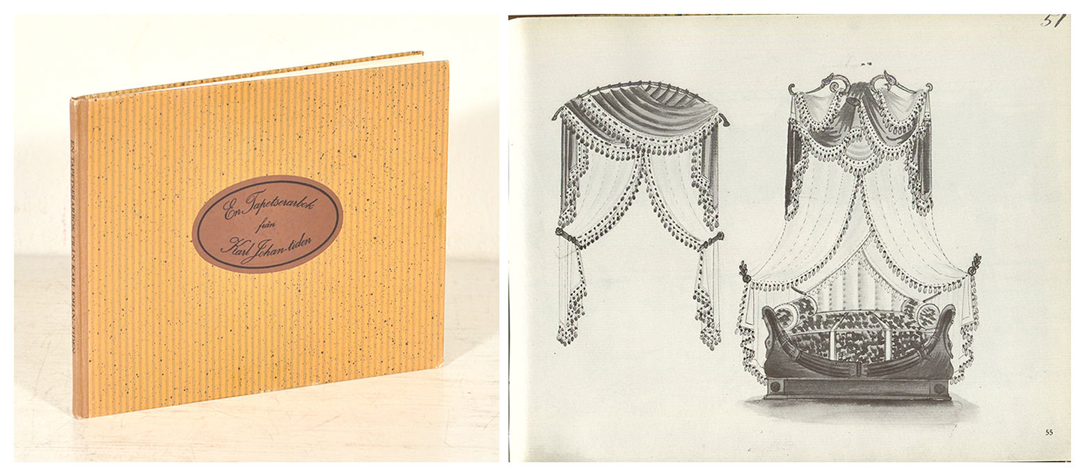 Faksimil i tvärformat av en akvarellerad handritad tapetserarbok, vars datering är osäker, men antingen är från 1820- eller 1840-tal, använd för Rosendals slott och Rosersberg och med F. J. Petterssons ägarnamnteckning. Den behandlar uteslutande gardinuppsättningar och sängomhängen.