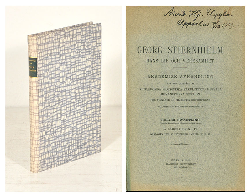 Uppsala, 1909. XXIII,(1 blank),125,(1 blank,1) s. Mönstrat pappbd med mörkblå titeletikett och stänkta snitt. Omslaget medbundet. Interfolierad med en del anteckningar. Med Arvid Hj. Ugglas namnteckning på främre omslaget daterad Uppsala den 7 december 1909.