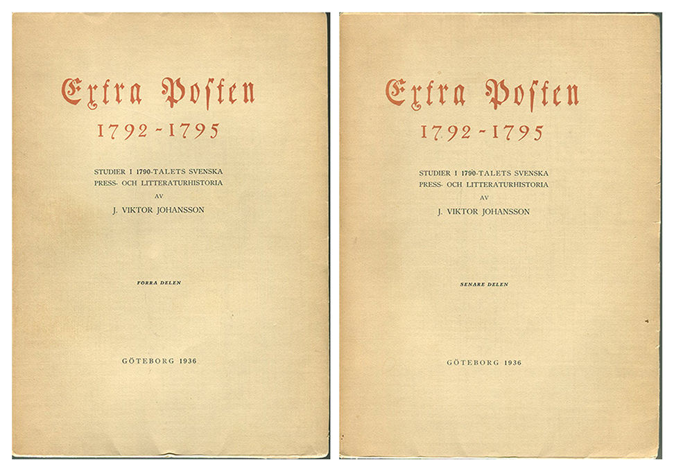 Göteborg, 1936. XVI,304 s. & 1 plansch + (4),187,(2) s. & 1 insatt originalnummer av ”Extra posten” från den 27 augusti 1794. Två häftade volymer. Lite ojämnt gulnade omslag med några småfläckar och några små revor närmast ryggen. Ryggarna med läsränder och lite nagg. Bakre omslag med små förlagsstplr från Wettergren och Kerbers förlag.