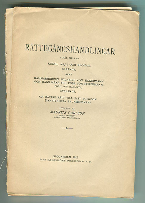Rättegångshandlingar i mål mellan kungl. maj:t och kronan, kärande, samt kammarherren Wilhelm von Eckermann och hans maka fru Ebba von Eckermann, född von Hallwyl, svarande, om bättre rätt till fast egendom (skatteköpta brukshemman) utgifna af Mauritz Carlson juris kandidat ombud för svarandena.