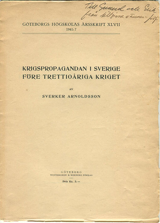 Göteborg, 1941. 36 s. Häftad i tryckt omslag. Liten fläck på bakre omslag. Dedikation till Gunnel och Erik på främre omslaget.