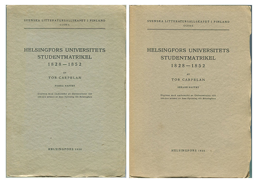 Skrifter utgivna av Svenska litteratursällskapet i Finland CCIII:1-2. Tor Harald Carpelan (1867-1960) var finländsk universitetstjänsteman och genealog. Han utgav även ”Finsk biografisk handbok” (1895-1905), ”Helsingfors universitets lärare och tjänstemän från år 1828” (1920-25) och ”Ättartavlor för de på Finlands riddarhus inskrivna efter 1809 adlade, naturaliserade eller adopterade ätterna” (1942-66).