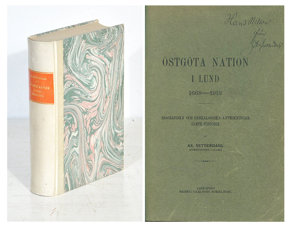 Linköping, 1913. 526 s. Bra halvpergamentbd med titeletikett av brandgult skinn, marmorerade pärmpapper, stänkta snitt och medbundet omslag (Carl Ek, Örebro). Omslaget aningen nött. Ryggen med några obetydliga småfläckar. Interfolierad. Dedikation till Hans Nilsson på främre omslaget.