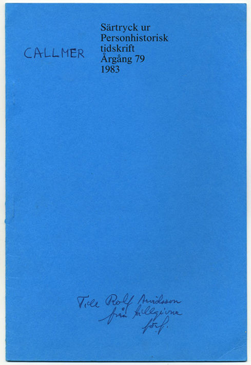 Sthlm, 1983. s. 20-30. Klammerhäftad. Författarnamnet skrivet i bläck på främre omslag. Med dedikation till Rolf Arvidsson.
