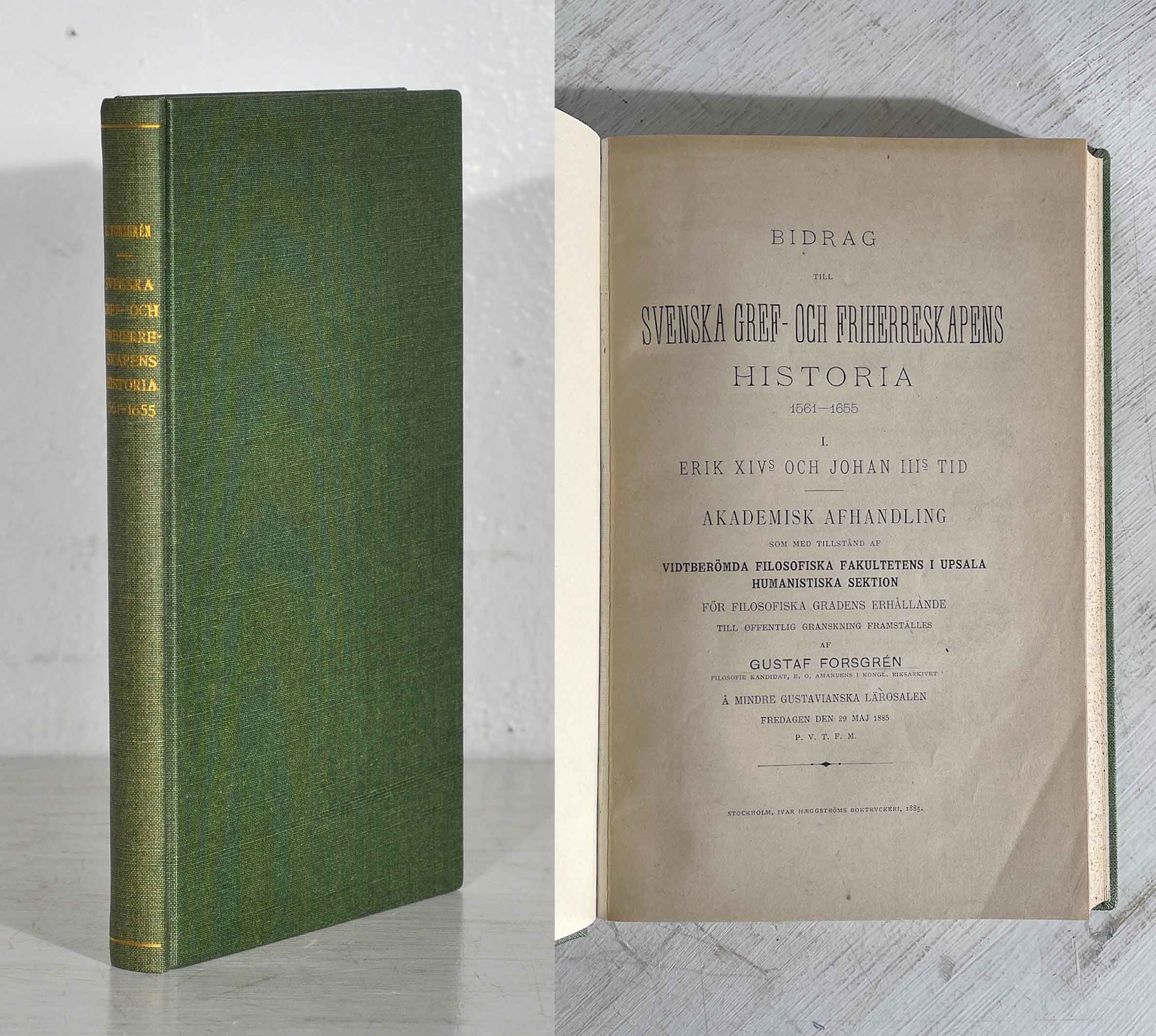 Allt som utkom. Första avdelningen med rubriken ”Grefvarnes och friherrarnes förhållanden under Erik XIV:s tid” och andra avdelningen ”Gref- och friherreskapen under Johan III:s tid”. Den avslutande romerska pagineringen består av tabeller och kommentarer till dessa. Berndt Gustaf Forsgrén (1845–87) ”blev 1885 fil dr i Uppsala på avhandlingen »Bidrag till svenska gref- och friherreskapens historia 1561–1655, 1. Erik XIV:s och Johan III: s tid». Den var grundad på vidlyftiga studier i bl a kammararkivets räkenskapsmaterial och belönades 1887 av Uppsala universitet med Geijerska priset. G F:s efterlämnade forskningsmaterial (16 vol) överlämnades 1892 till riksarkivet, där G F tjänstgjort som eo amanuens från 1879. Han var 1883–87 även amanuens hos K Samfundet för utgifvande af handskrifter rörande Skandinaviens historia” skriver ”Svenskt biografiskt lexikon”.
