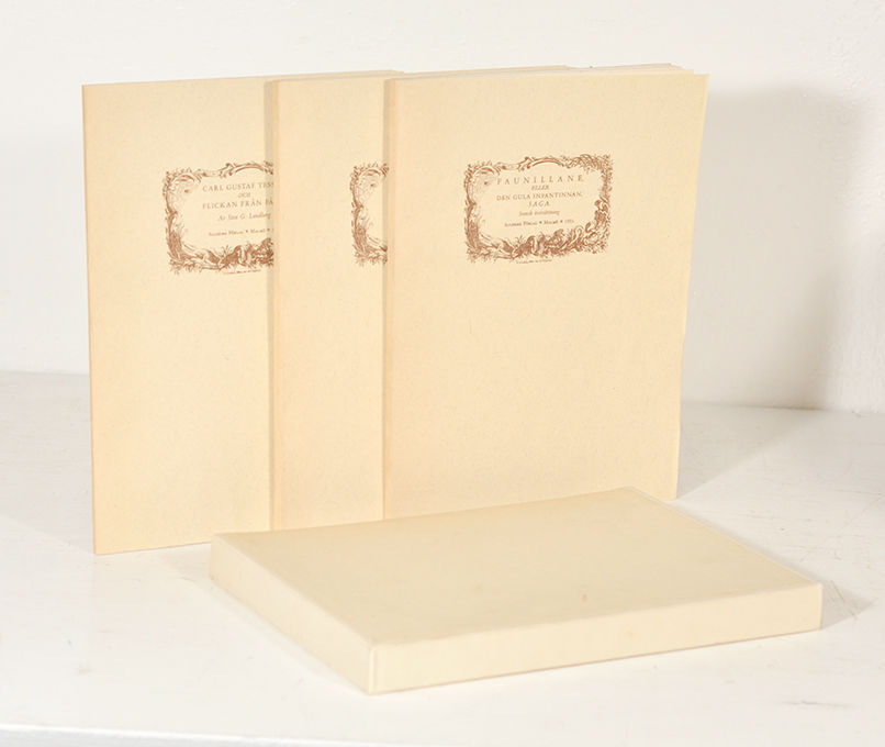 Malmö, 1955. (16),28,(5) s. + (TESSIN, CARL GUSTAF) Faunillane, eller den gula infantinnan, saga. Malmö, 1955. (16),29,(4) s. + LINDBERG, STEN G. Carl Gustaf Tessin och flickan från Fånö. Malmö, 1955. 35,(2) s. Tre oskurna och delvis ouppskurna häften i en ohalvklotkassett.
