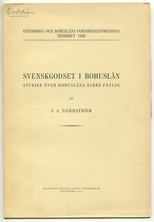 Svenskgodset i Bohuslän. Studier över Bohusläns äldre frälse. Särtryck ur Göteborgs och Bohusläns fornminnesförenings tidskrift 1936.