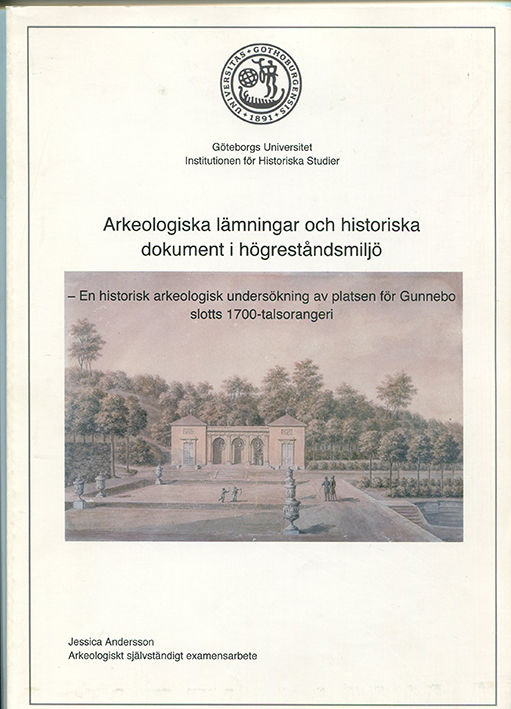 Arkeologiskt examensarbete. Jessica Anderssons magisteruppsats vid Göteborgs universitet vid Institutionen för historiska studier. Innehåller: ”Inledning”, ”Teori”, ”Orangerier i 1700-talets högreståndsmiljöer”, ”En studie av de historiska källorna rörande Gunnebo slotts 1700-talsorangeri och 1800-talsväxthus”, ”Arkeologiska undersökningar inför återskapandet av 1700-talets Gunnebo och dess orangeri” och ”De arkeologiska resultaten av undersökningen av Gunnebo slotts 1700-talsorangeri i jämförelse med de historiska dokumenten”. Gunnebo slotts orangeri genomgår sedan 2013 en rekonstruktion för att åter likna Carl Wilhelm Carlbergs (1746-1814) ursprungliga ritningar.