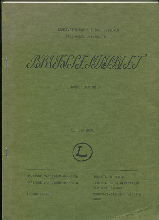 Konstvetenskapliga institutionen Stockholms universitet. Bruksseminariet kompendium nr 5. Innehåller: ”Inledning”, ”Källmaterial”, ”Brukets historia” och ”Leufsta bruks herrgårdar och brukskyrkor” av Marianne Sandström-Hanngren och ”Bruksbebyggelse i Leufsta bruk” av Barbro Edling.
