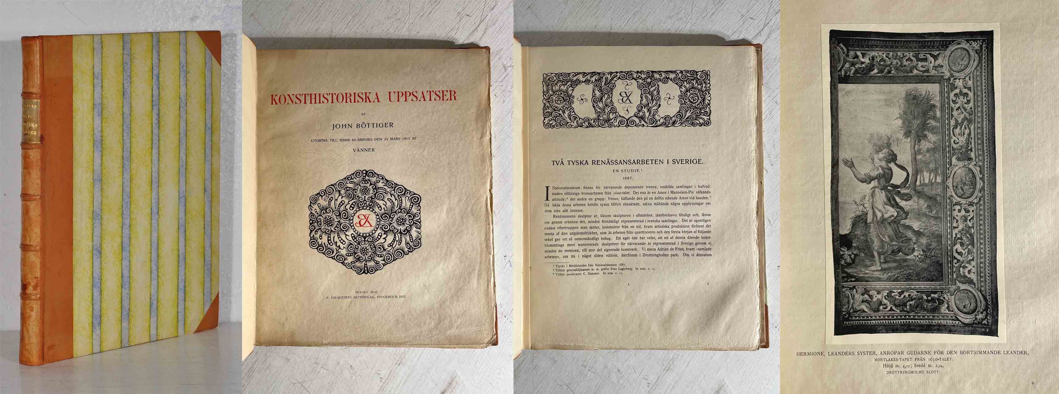 Tryckt på extrafint papper i 155 numrerade exemplar, varav detta är nummer 31. Vackert dekorerad med vinjetter. Innehåller uppsatserna ”Två tyska renässansarbeten i Sverige. En studie” (1887), ”Karl den niondes tapetväfveri och tapetsamling” (1895), ”En tapets historia” (1897), ”Till Gripsholmservisens historia” (1900), ”Ur studier till en svensk möbelhistoria” (1905), ”En konstsamlare på 1600-talet. Några antydningar om Philip Hainhofers konstuppfattning” (1909), ”Det gamla och det nya Drottningholm” (1912) och ”Porträttframställning i tapisserie” (1912).