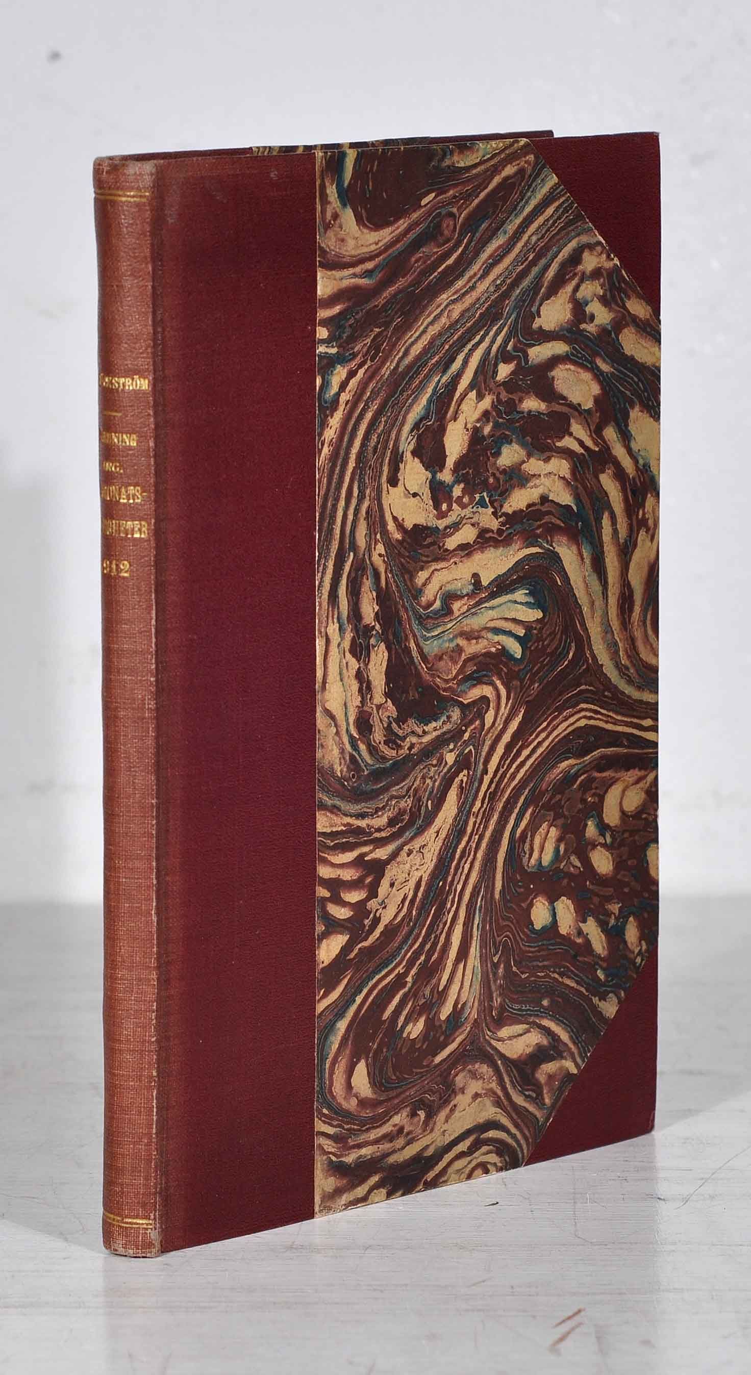 Sthlm, 1914. 212,(1) s. Något nött vinrött hklbd med guldlinjerad rygg och guldpressad ryggtitel, ryggtiteln läser år 1912. Svagt infärgat övre snitt. Ryggen något blekt och lite tilltryckt allra överst.