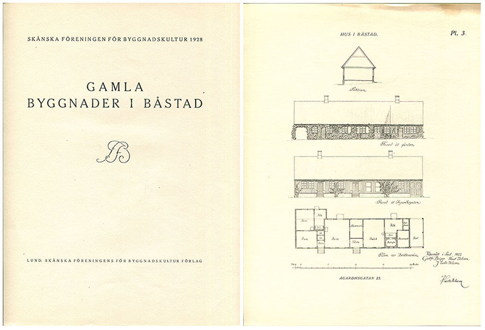 Skånska föreningens för byggnadskultur årspublikation 1928. Skånska gårdar och hus utgivna av Gottfrid Beijer och Fritjof Hazelius. Andra bandet. Femte häftet. Stora delar av äldre Båstad har förstörts i bränder 1742 och 1870. De kvarvarande delarna som planscherna visar berör framförallt Agardhsgatan.