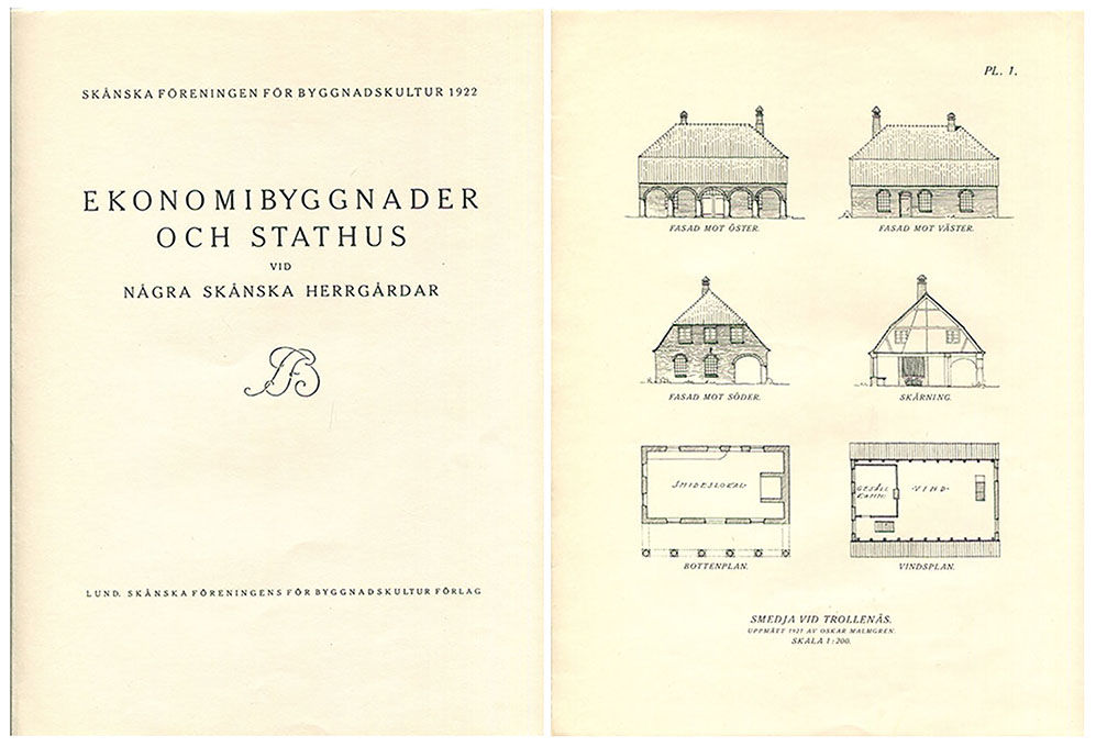 Skånska föreningens för byggnadskultur årspublikation 1922. Skånska gårdar och hus utgivna av Karl Berlin och Fritjof Hazelius. Andra bandet. Andra häftet. Planscherna avbildar smedja vid Trollenäs, spannmålsmagasin vid Rögle och Skarhult samt stathus vid Skarhult.