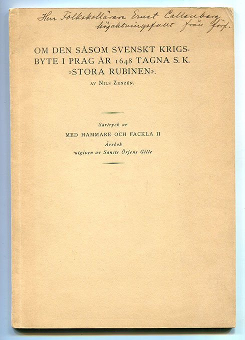 Om den såsom svenskt krigsbyte i Prag år 1648 tagna s.k. ”stora rubinen”. Särtryck ur Med hammare och fackla II.