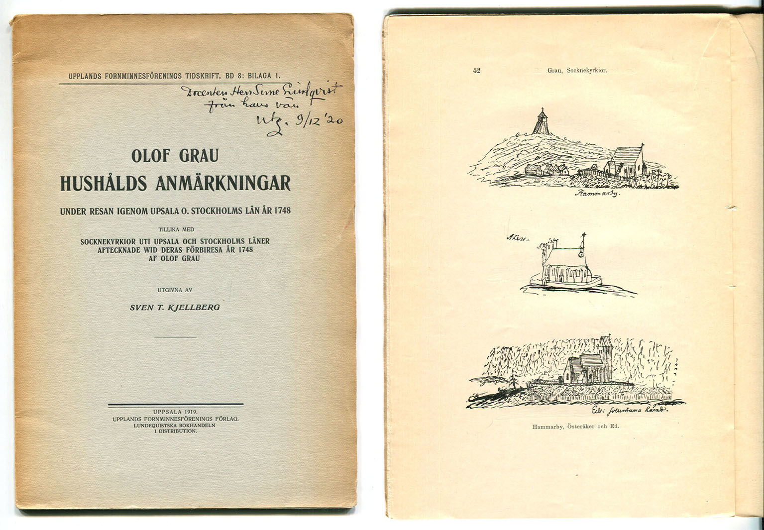 Uppsala, 1919. 48 s. Häftad. Något nött och omslaget med kraftigt mörknade kanter, mest på baksidan. Med dedikation från utgivaren till Sune Lindqvist daterad 1920. Upplands fornminnesförenings tidskrift, bd 8: bilaga 1. Med en inledning av utgivaren Sven T. Kjellberg och därefter ”Hushålds anmärkningar” på sidorna 9-30 och avbildningarna på sidorna 33-48. Olof Grau (1722-74) var salpetersjuderidirektör och bekant genom sin ”Beskrifning öfwer Wästmanland med sina städer, härader och socknar” utgiven 1754. Anmärkningarna från Upplandsresan publiceras i föreliggande verk för första gången.