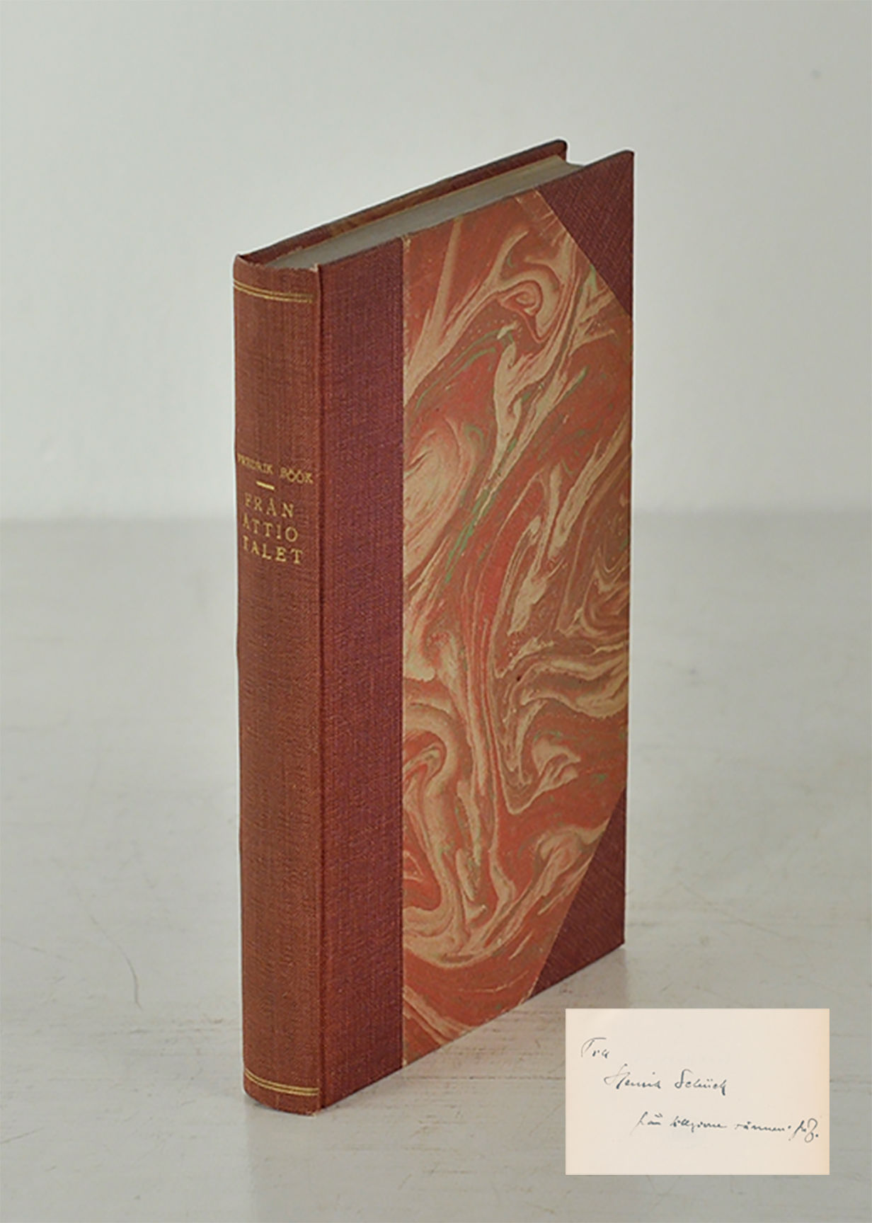 Sthlm, 1926. 327 s. Rött hklbd med sparsamt guldornerad rygg, marmorerade pärmpapper, infärgat övre snitt och medbundet främre omslag. Lätt blekt rygg. Dedikation till Henrik Schück på smutstitelbladet.