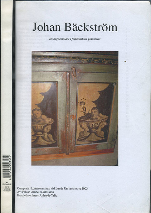 Johan Bäckström. En bygdemålare i folkkonstens gränsland. C-uppsats i konsthistoria vid Lunds universitet vt. 2003. Stenciltryck.