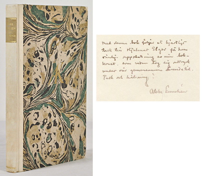 Sthlm, 1945. 181,(7) s. Med illustrationer i texten & inklistrade tryckexempel. Något nött och aningen solkigt ohalvpergamentbd med blekt titeletikett i skinn och övre infärgat snitt. Omslaget medbundet. Ryggen med liten skada allra nederst. Prydlig dedikation till Hjalmar Elger från Akke Kumlien och ett signerat tackkort från honom skrivet 1934.