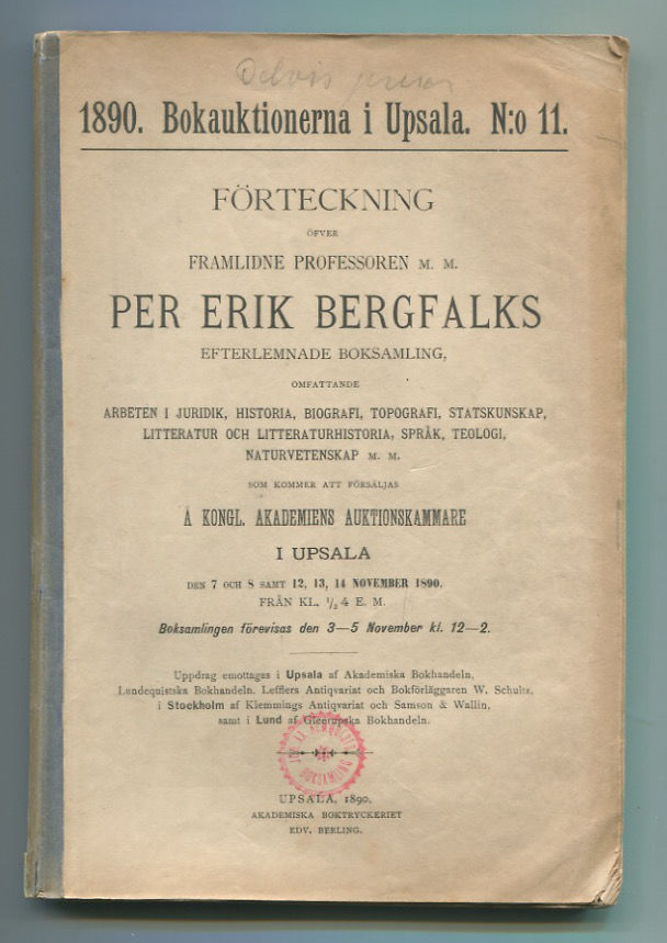 Förteckning öfver framlidne professoren m.m. Per Erik Bergfalks efterlemnade boksamling, omfattande arbeten i juridik, historia, biografi, topografi, statskunskap, litteratur och litteraturhistoria, språk, teologi, naturvetenskap m.m. som kommer att försäljas å kongl. Akademiens auktionskammare i Upsala den 7 och 8 samt 12, 13, 14 november 1890. [...].