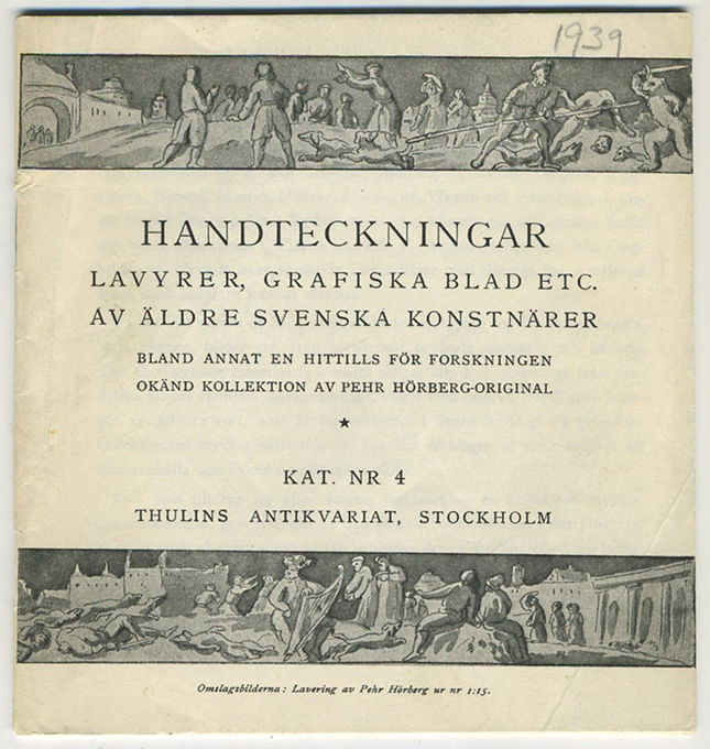 Thulins antikvariat. Kat. nr 4. Handteckningar. Lavyrer, grafiska blad etc. av äldre svenska konstnärer. Bland annat en hittills för forskningen okänd kollektion av Pehr Hörberg-original.