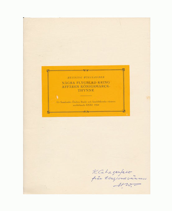 Några flygblad kring affären Königsmarck-Thynne. Ur Samfundet Örebro Stads- och länsbiblioteks vänners meddelande XXXI 1964.