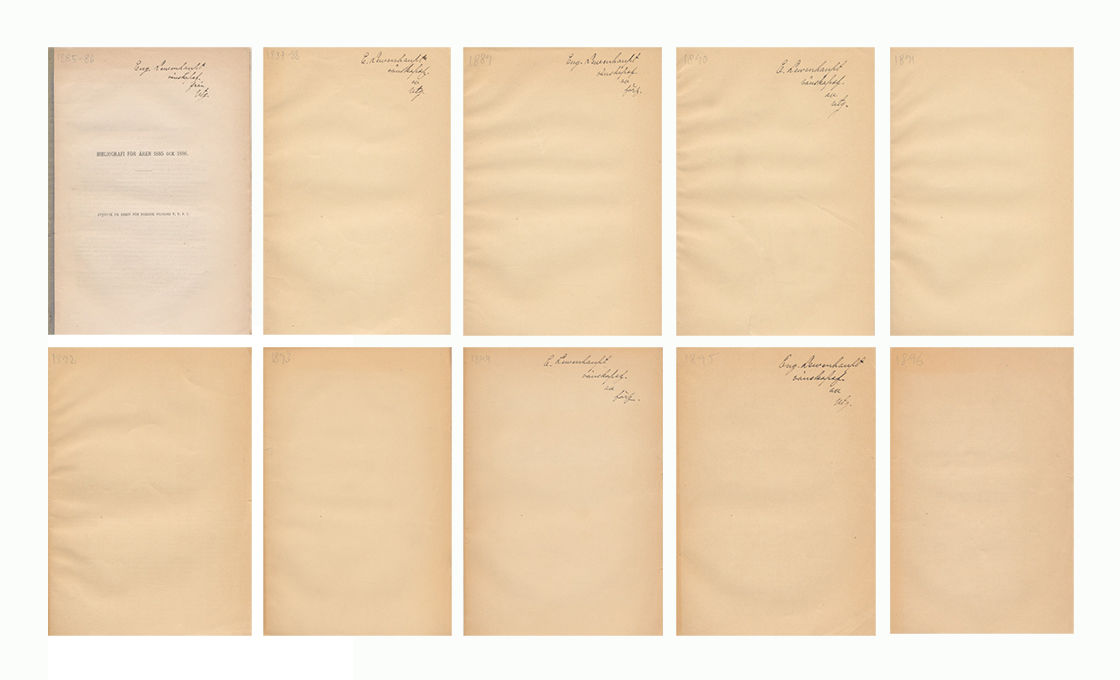 (Lund, 1886-98). (1),172-222 + (1 blank),176-220 + 265-92 + 275-303 + 269-303 + 355-86 + 272-305 + (1 blank),284-313 + (1 blank),282-311 + (1 blank),296-328 s. Tio häften, det första med ryggremsa, de övriga med blanka omslag. Oskurna och ouppskurna. Sex av häftena med dedikation till Eugène Lewenhaupt. Ur Säbylunds bibliotek.